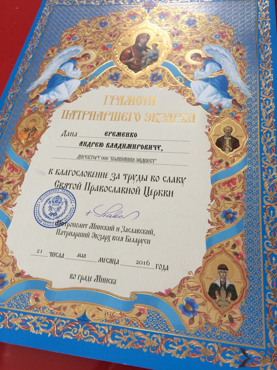 После службы владыка Павел вручил грамоты Патриаршего Экзарха благотворителям и потрудившимся в деле строительства храма. Компания Эндвест и ее руководитель Еременко Андрей Владимирович так же были удостоены такой чести.